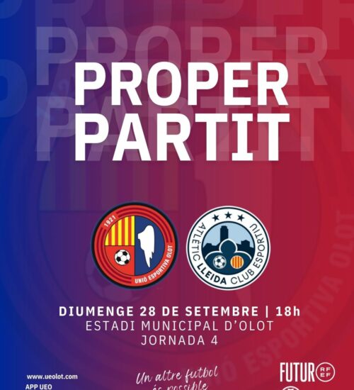 La Unió Esportiva Olot vol mantenir la dinàmica positiva amb la visita aquest diumenge (18h, La Xarxa+) de l'Atlètic Lleida de Gabri Garcia, vell conegut de l'afició olotina. Un recent ascendit que encadena tres empats consecutius i compta amb gent experimentada a la categoria. Roger Vidal, que aviat ja podrà comptar amb Breñé i Gonpi, demana personalitat amb pilota i exigència màxima per treure un bon resultat. Un dia en el qual encetem noves activitats a l'Estadi Municipal per incentivar la presència de públic i l'arrelament amb la ciutat.