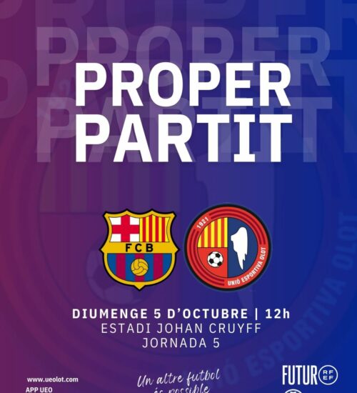 La Unió Esportiva Olot es desplaça aquest diumenge (12h, Esport3) al camp del FC Barcelona Atlètic amb la voluntat de mantenir la trajectòria positiva d'aquest inici de temporada. Roger Vidal ja pot disposar d'Ivan Breñé i Álex Gonpi, tots dos amb l'alta mèdica després de la lesió a la clavícula, i només té el dubte d'Andreu Guiu. Al davant, un filial de Belletti que és líder compartit i que ha guanyat tres dels quatre partits, inclòs al Narcís Sala. Prova de foc a l'Estadi Johan Cruyff, on els olotins no han puntuat en cap dels precedents.