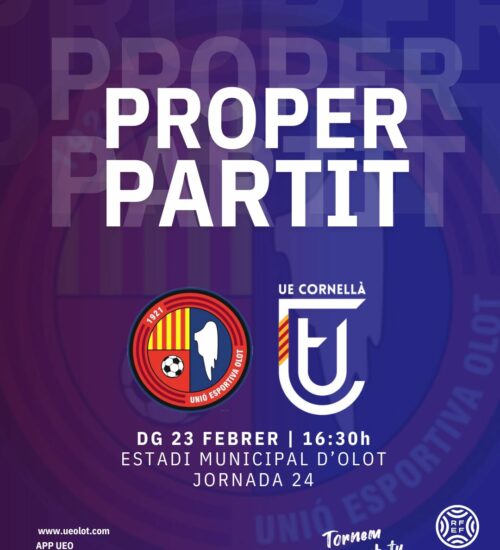 La Unió Esportiva Olot, per primer cop fora del descens en moltes setmanes, rep la visita d'un dels perseguidors més immediats, la UE Cornellà (diumenge, 16.30h). Els de Roger Vidal s'han fet forts en defensa i ara busquen, per fi, una alegria a l'Estadi Municipal per deixar tocat a un altre rivals que lluita per la salvació. Els del Baix Llobregat, ara amb Alberto Lopo a la banqueta, s'han reforçat a consciència en el mercat d'hivern per evitar el segon descens consecutiu. Recordeu que el partit es juga mitja hora abans de l'habitual i que serà retransmès en directe, per primer cop, per Esport3. Activem la promoció soci+acompanyant per omplir el camp.