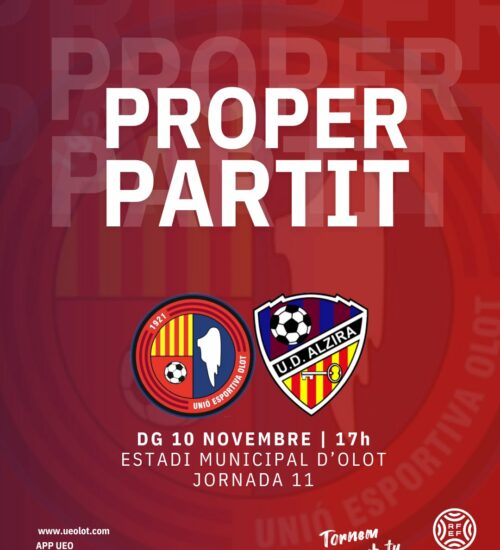 La Unió Esportiva Olot torna a jugar a casa per segona setmana consecutiva i ho fa aquest diumenge (17h) davant de la UD Alzira, un rival directe a la classificació. Després de donar minuts als menys habituals a la Copa Catalunya, Dólera espera anar recuperant efectius però encara tindrà les baixes de Maynau, De Marco i s'hi afegeix el porter Jan Danés, a més dels dubtes de Juvi i Pau Salvans. Tot plegat, en una jornada solidària amb recollida de material per als pobles del País Valencià afectats per la DANA.