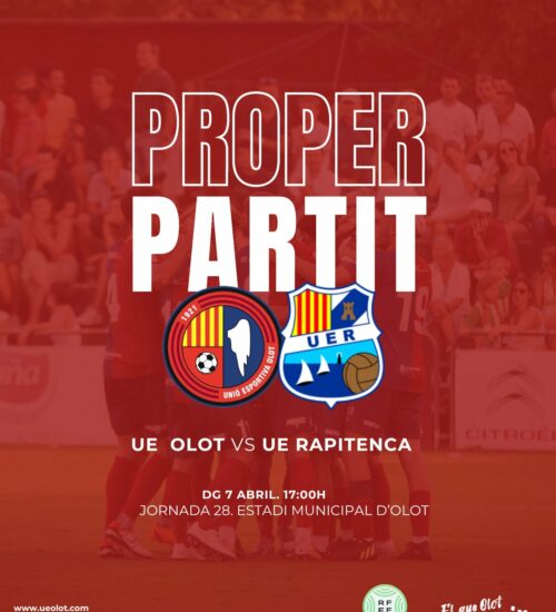 La Unió Esportiva Olot busca la quarta victòria consecutiva per donar una estrebada gairebé definitiva cap al títol de lliga. Serà aquest diumenge a les 17h davant de la UE Rapitenca, immersa de ple en la lluita per la permanència i que ha guanyat tres dels cinc últims partits. Novament, el factor Estadi ha de ser clau en una jornada especial amb Fan Zone prèvia per escalfar l'ambient. Dólera tindrà la baixa d'Urri per targetes i Ayala per sanció. Visita del CF Vall d'en Bas i reconeixement a Recuperacions Solé amb protagonisme també per al TEA Garrotxa.