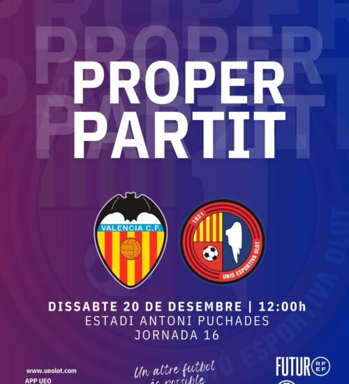 La Unió Esportiva Olot fa el més difícil, neutralitzar un 2-0 en contra, però es queda a les portes de puntuar per culpa d'un gol de Rodri en una acció a pilota aturada en temps afegit. Primera meitat complicada amb domini dels valencians, que s'han avançat amb diana de Víctor Jr, que ha repetit a l'inici de la represa. La reacció olotina ha arribat de la mà de Rubén Enri, autor d'un doblet i que a punt ha estat de fer el tercer en un parell d'ocasions. Marxem amb 19 punts a l'aturada nadalenca per desconnectar i intentar revertir la dinàmica.