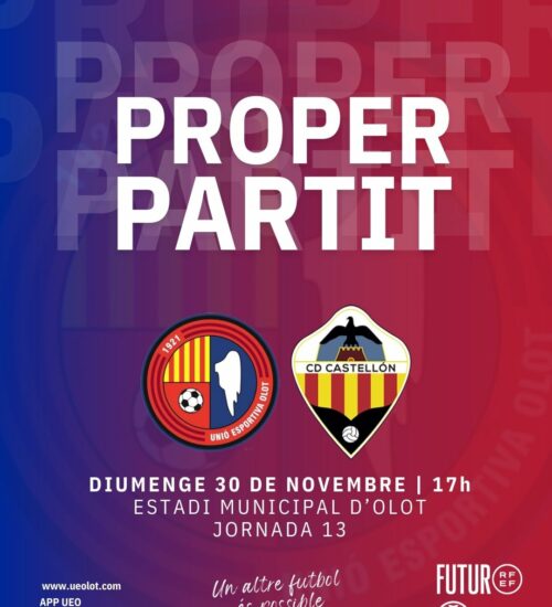 La Unió Esportiva Olot es desfà del filial del CD Castellón en una gran primera meitat d'ocasions i bon futbol. Els de Roger Vidal han marxat al descans amb els gols de Rubén Enri i Marc Mas, els dos d'autèntics depredadors d'àrea. El filial castellonenc ha intentat reaccionar a la represa però s'ha topat amb la defensa més sòlida de la lliga. A destacar, el debut com a titular d'Andreu Guiu en una tarda amb prop de 900 espectadors a l'Estadi. Seguim imbatuts a casa i escalem algunes posicions abans de visitar l'Andratx.