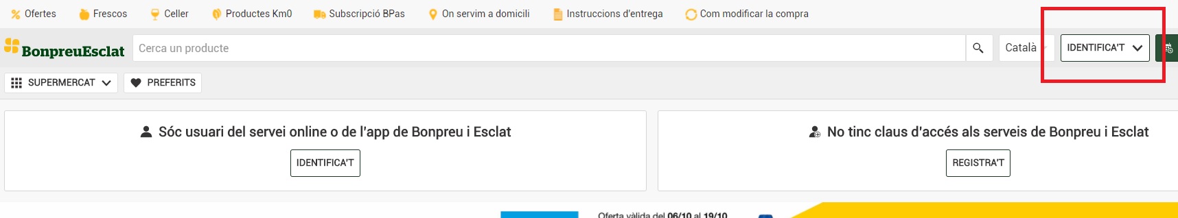 1. Accedir a la web www.compraonline.bonpreuesclat.cat i cliqui a IDENTIFICA’T que apareix a la part superior dreta de la pàgina.