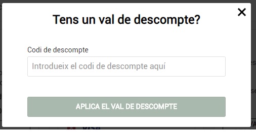 És en aquest punt on utilitzarem els codis promocionals de la UE OLOT que haurà rebut a la carta de promocions que vàrem enviar. Cliqui a VAL DESCOMPTE. En funció de la data en que realitzi la seva compra haurà d’introduir un codi o un altre.