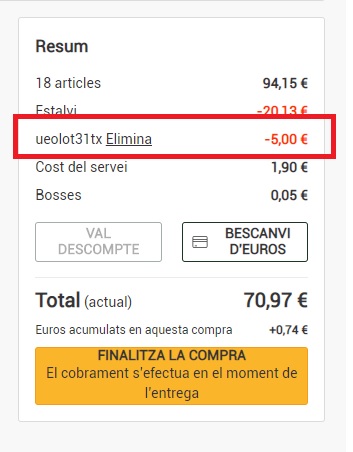 6. Clicant a APLICA VAL DE DESCOMPTE, se lo deduiran de l’import de la compra els 5,00 € del val.