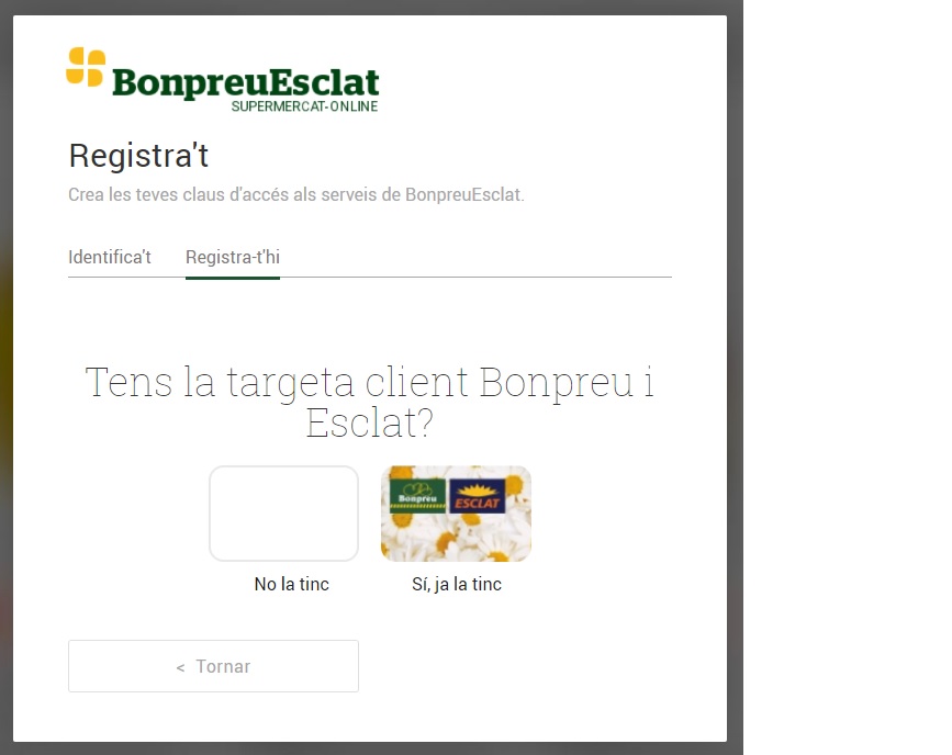 3. Si és la primera vegada, Cliqui a Registra’t, seleccioni si disposa o no de targeta Client i ompli les dades que li demanen al formulari. Aquestes dades serviran per accedir-hi en un futur.