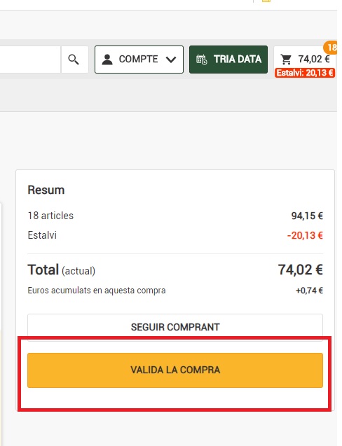 Quan finalitzi la selecció de productes, cliqui sobre l’import:i després sobre VALIDAR COMPRA:
