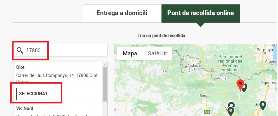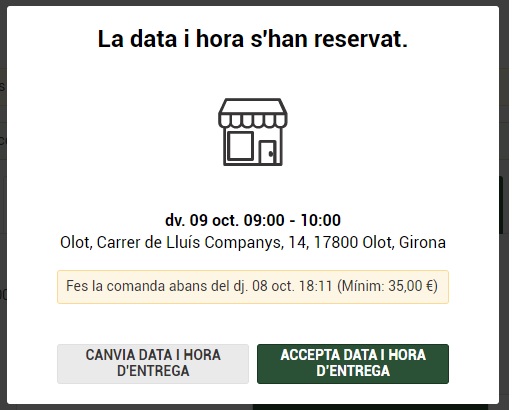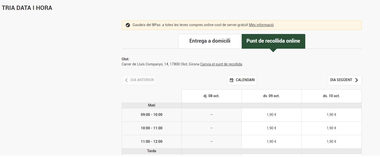 7. A partir de llavors ja pot seleccionar on vol fer la recollia i la data i l’hora.           Un cop finalitzat el procés, només haurà de dirigir-se amb el cotxe al lloc de recollida assignat (a OLOT està situat al costat de la benzinera ESCLAT prop de l’Estadi Municipal) i la gent de Bonpreu-Esclat li entregaran la seva compra.